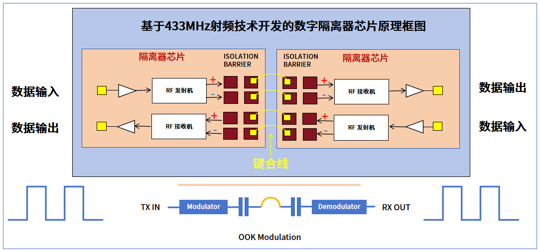 在此芯片框架中,射频发射端会将要进行传输的数字信号通过OOK调制为高频脉冲信号,而后经电容电场耦合至射频接收端,并通过OOK解调为初始的数据信号,从而实现数字信号的安全传输。