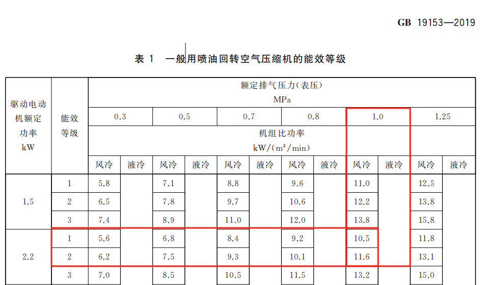 在国家强制标准GB 19153-2019《容积式空气压缩机能效限定值及能效等级》中,规定了空压机能效等级分为1级、2级和3级。其中1级能效为国际先进水平,产品耗能最低,最为节能;2级能效为优于行业平均水平,产品耗能较低,较为节能;3级能效为行业平均水平,产品耗能较高,但基本符合国家对节能的最低要求。